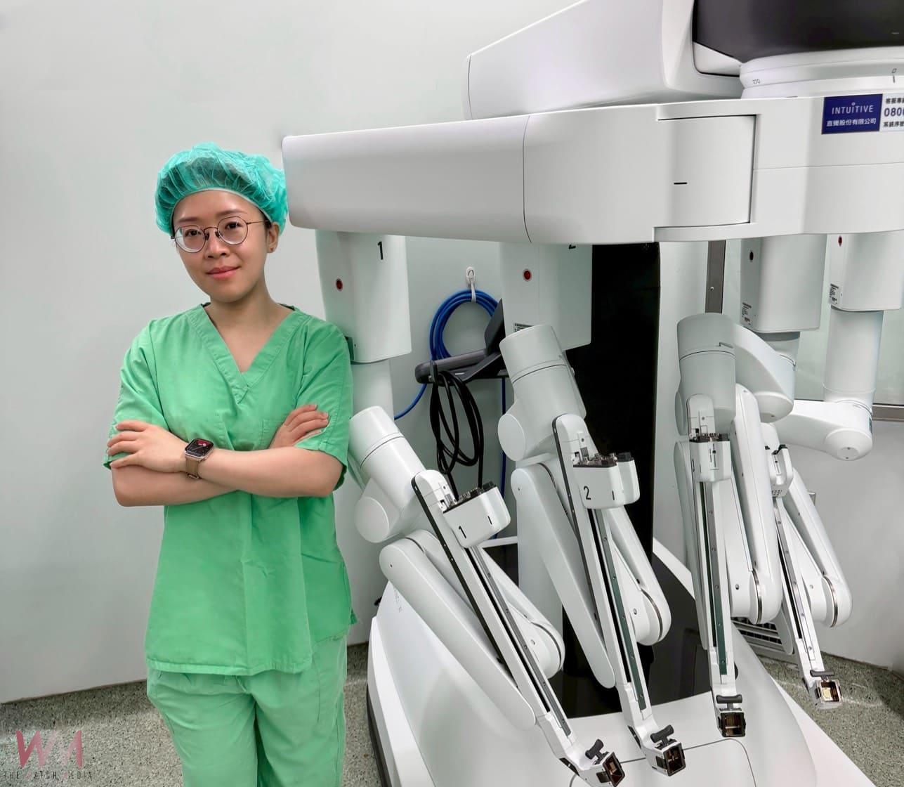 林宜右醫師和達文西機器人手術機器。(圖/記者廖妙茜翻攝)