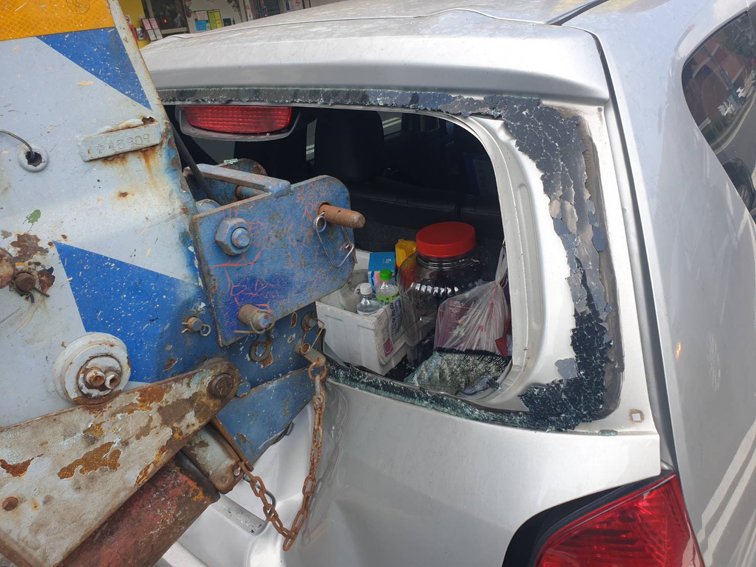 「那聲音真的太大了!」目擊民眾回憶,當下聽到巨響後抬頭一看,只見吊臂插進轎車內,整輛車像被巨力撞擊般震動,嚇得路人全愣住。葉姓女駕駛則說,自己原本專心等紅燈,突然一聲「碰」巨響從車後傳來,「我回頭看到吊臂插進來,整個人都僵住!」她事後仍心有餘悸,直說「要是後座有坐人,後果不堪設想」。