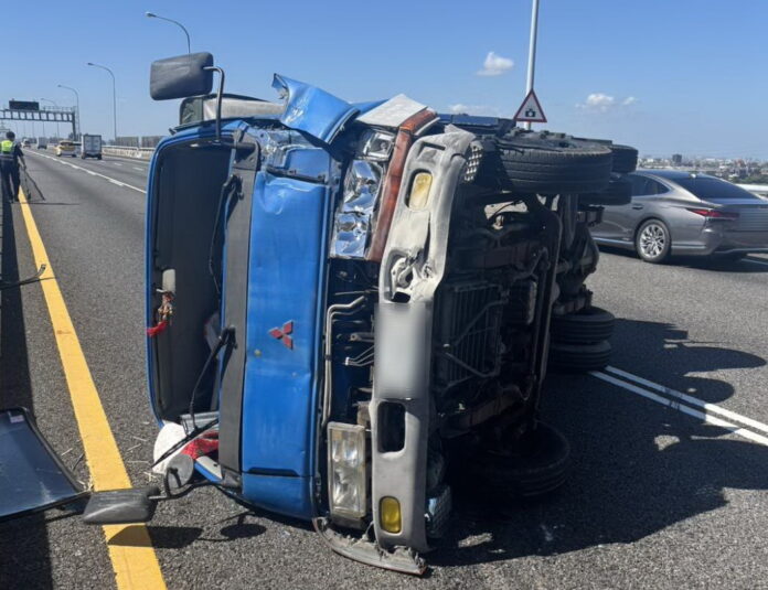 據了解,70歲吳姓男子駕駛自小貨車,行經該路段時,疑因操作不當,自撞內側護欄導致車輛側翻,翻覆於高乘載車道。事故造成2名人員輕傷,經救護車送往附近醫院治療。為進行吊掛作業,現場於上午10時21分封閉主線3車道,後方車流回堵約3公里,影響早高峰交通。於10時36分完成排除,全線恢復正常通車,車輛通行時間僅延遲約半小時。