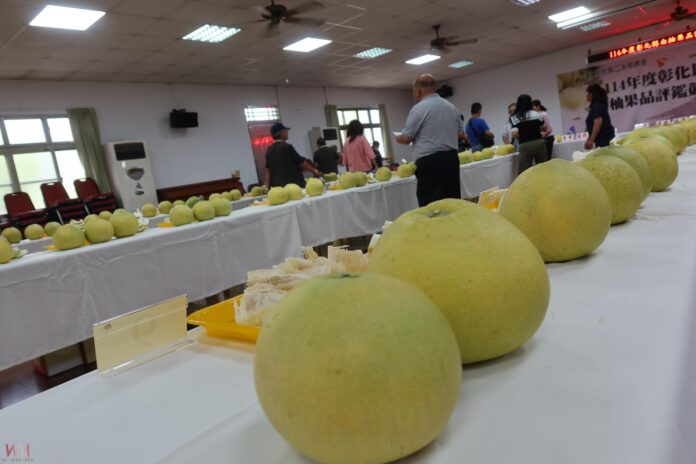 霜降節氣正好也是白柚採收期,二水鄉農會舉辦白柚評鑑活動,28組農友帶來最新收成比拚品質。(記者陳雅芳攝)