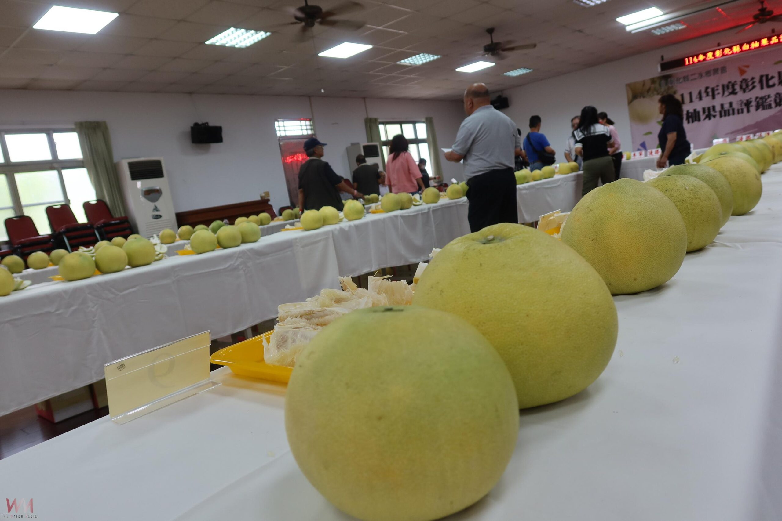 為振興二水白柚產業,二水鄉農會今年再度舉辦白柚評鑑,吸引全縣28組農友參賽,現場氣氛熱鬧非凡。評鑑現場,專家們細心檢視每顆白柚的果形、果皮光澤、大小均勻度、甜度及風味。評審團由產官學界6位專家組成,他們一邊翻轉白柚、一邊用筆記下細膩觀察。