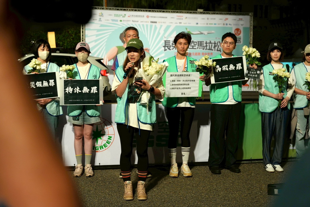 所以,我站在這裡,首先代表長榮空服員,對社會大眾、對各位跑者表達感謝,是你們的溫柔和支持,療癒了我們內心深處遍體鱗傷的自己。所以,我們站在這裡,想再跟你們多借一份力量,用溫柔和堅定,一起喚醒長榮航空,在人性和非人性的選擇之間,在請假無罪和請假被懲罰的選擇之間,長榮航空可以站在同理心的這一邊。