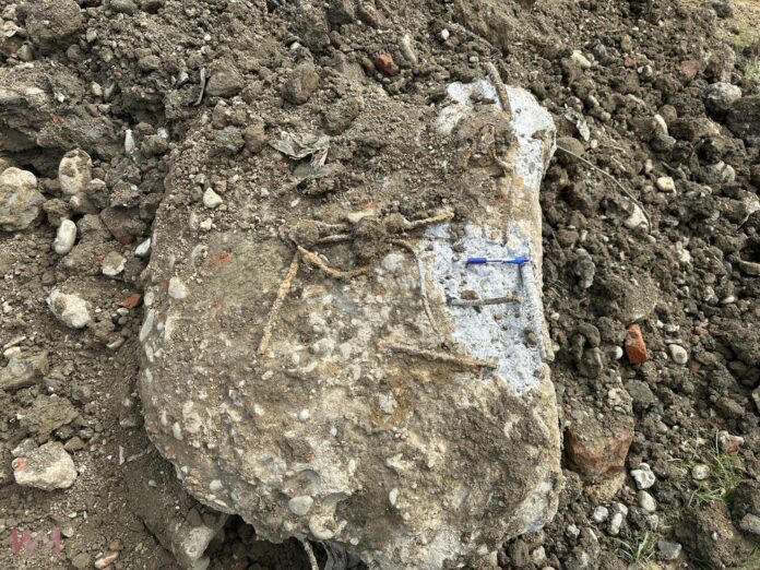 新竹市立棒球場今(3)日展開「外野區域回填土」的開挖作業,發現回填土中、混雜大量不符合規範的大型混凝土塊、紅磚塊與其他建築廢材。(圖由新竹市政府提供)