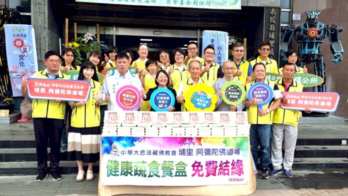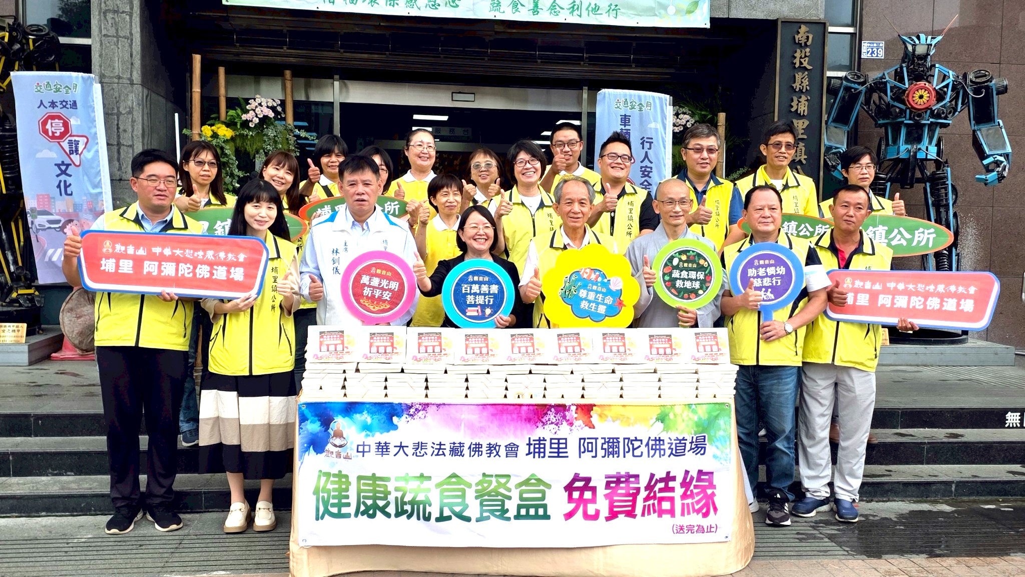 (觀傳媒中彰投新聞)【記者石振賢/南投報導】11月11日觀音山中華大悲法藏佛教會-埔里分會:觀音山 阿彌陀佛道場,佛教會住持-慈悲 龍德上師秉承佛陀慈悲願心,「自利利人,自覺覺他」的精神,長年不間斷推廣各項慈善事業,尊重生命、品德教育、慈悲關懷弱勢,傳遞善良風氣,一起以善行義舉讓社會人心更加光明。11日殊勝的神變月-佛陀天降日,依照經典紀載,今日行善有十億倍功德,特別在今天與埔里鎮公所共同舉辦「惜福環保感恩心‧蔬食善念利他行」,免費贈送600份美味蔬食便當,邀請埔里鎮公所、埔里鎮民代表會、埔里衛生所、埔里戶政事務所、埔里地政事務所、財政部中區國稅局埔里稽徵所、警察局埔里分局、稅務局等單位共同響應蔬食環保救地球,以及埔里當地的民眾朋友。