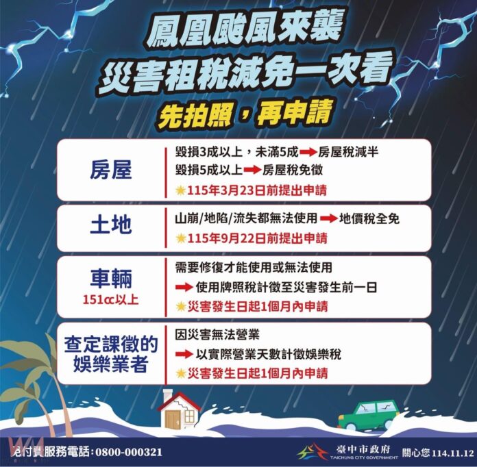 地稅局長沈政安說明,市民朋友如果房屋因颱風受損,毀損面積達整棟5成以上、須修復才能使用,房屋稅可全免;毀損面積達3成以上未滿5成者,可申請減半徵收。提醒受災民眾應先拍照或錄影存證,並於明年3月23日前提出申請。如果土地因災害發生山崩、地陷、流失或沙壓,致環境條件及技術上無法使用,可於明年9月22日前申請地價稅全免。