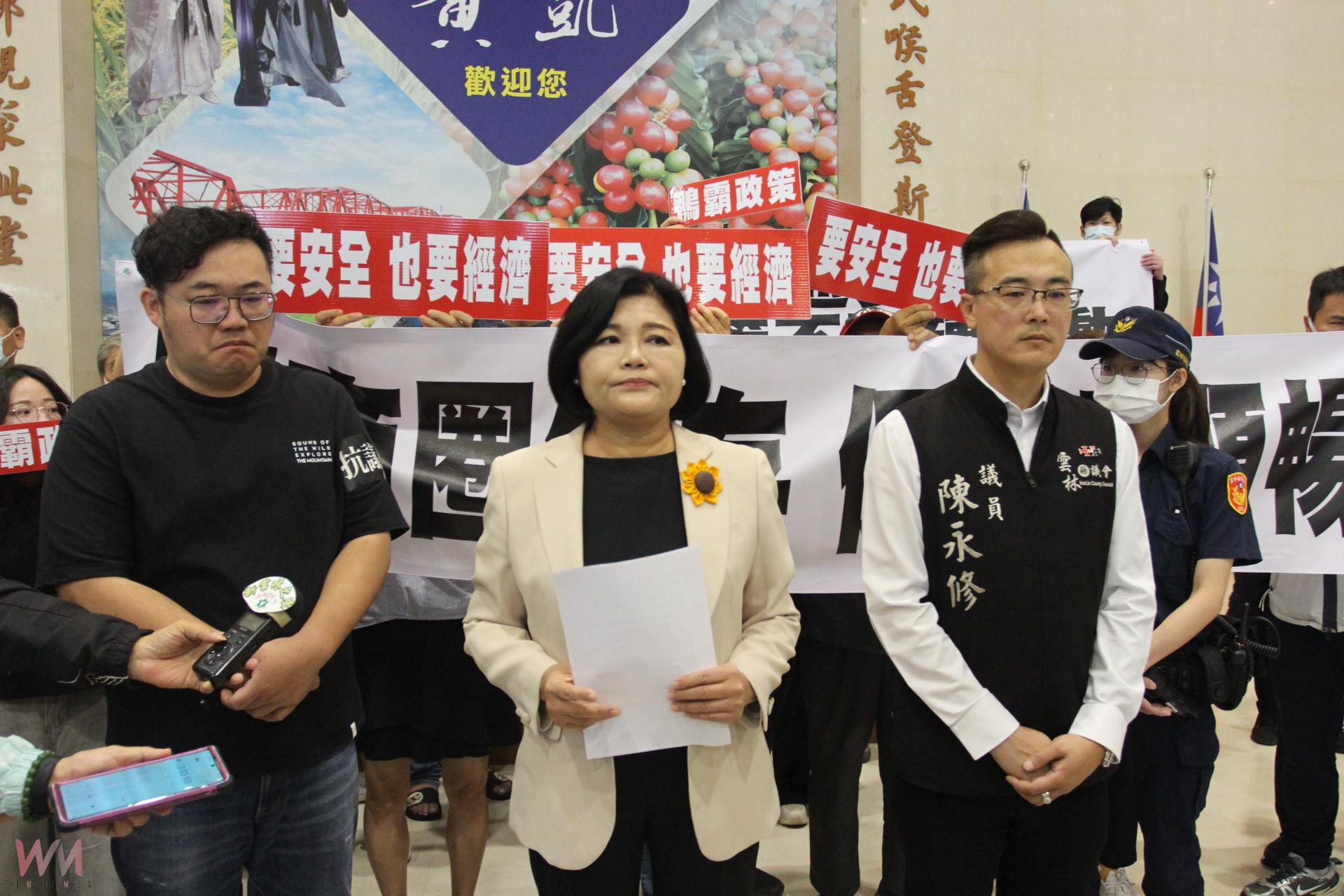 反對斗六市民生南路建置人行道的數十名商圈聯合會成員,今(13)日上午手持布條和看板,前往縣議會向縣長張麗善陳情。(圖/記者簡勇鵬攝)
