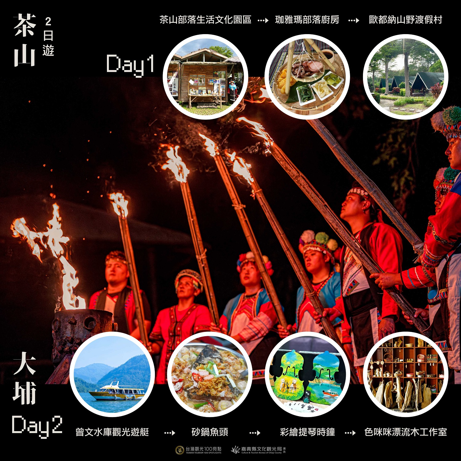 文觀局表示,位於阿里山的「茶山部落生活文化園區」是推動鄒族文化觀光的重要據點,園區以文化傳承為核心,設計多項互動體驗活動,包括傳統團康舞、搗麻糬、射箭、吹月桃鳥笛、甩風笛等,讓遊客以遊戲方式走入鄒族生活與文化精神。園區內的「珈雅瑪部落廚房」以在地食材入菜,展現鄒族飲食風味,並提供月桃編織、香氛蠟燭等手作課程,讓旅人能親手創作專屬文化紀念品,感受部落工藝的細膩與溫度。