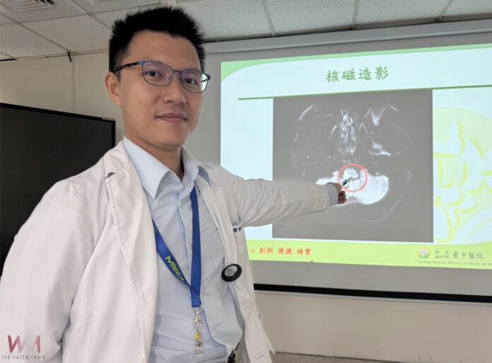 衛生福利部台中 醫院神經內科吳宇軒醫師指著患者核磁共振影像,說明患者腦幹右側血栓導致腦幹中風的位置。(圖/記者廖妙茜翻攝)