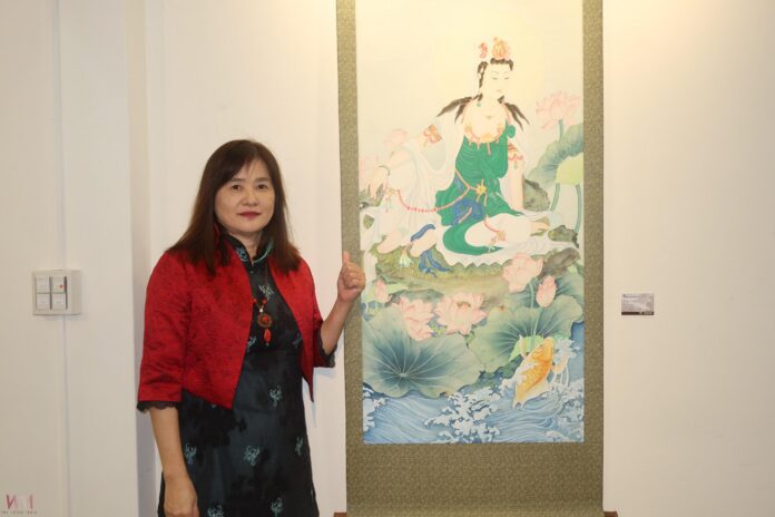 陳麗玉老師任教數學超過30年,退休後才全心投入藝術創作,從傳統水墨、寫意花鳥到工筆佛畫都有涉獵。近三年專注唐卡與佛畫創作,她作畫前必茹素、淨手,以虔誠之心完成作品。