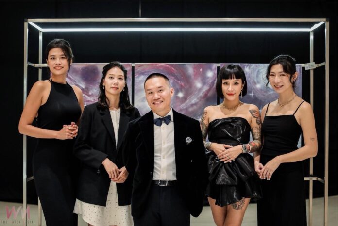 噴畫藝術家Derex永恩 (中)歡慶個人首展開展,特別邀請海浪藝術家謝昀庭(左1)、花藝師雅真(左2)、創作者梁云菲 NANA(右2)、香氛療癒師李杰穎 Jill(右1)共同揭開展覽序幕。(圖/記者廖妙茜拍攝)