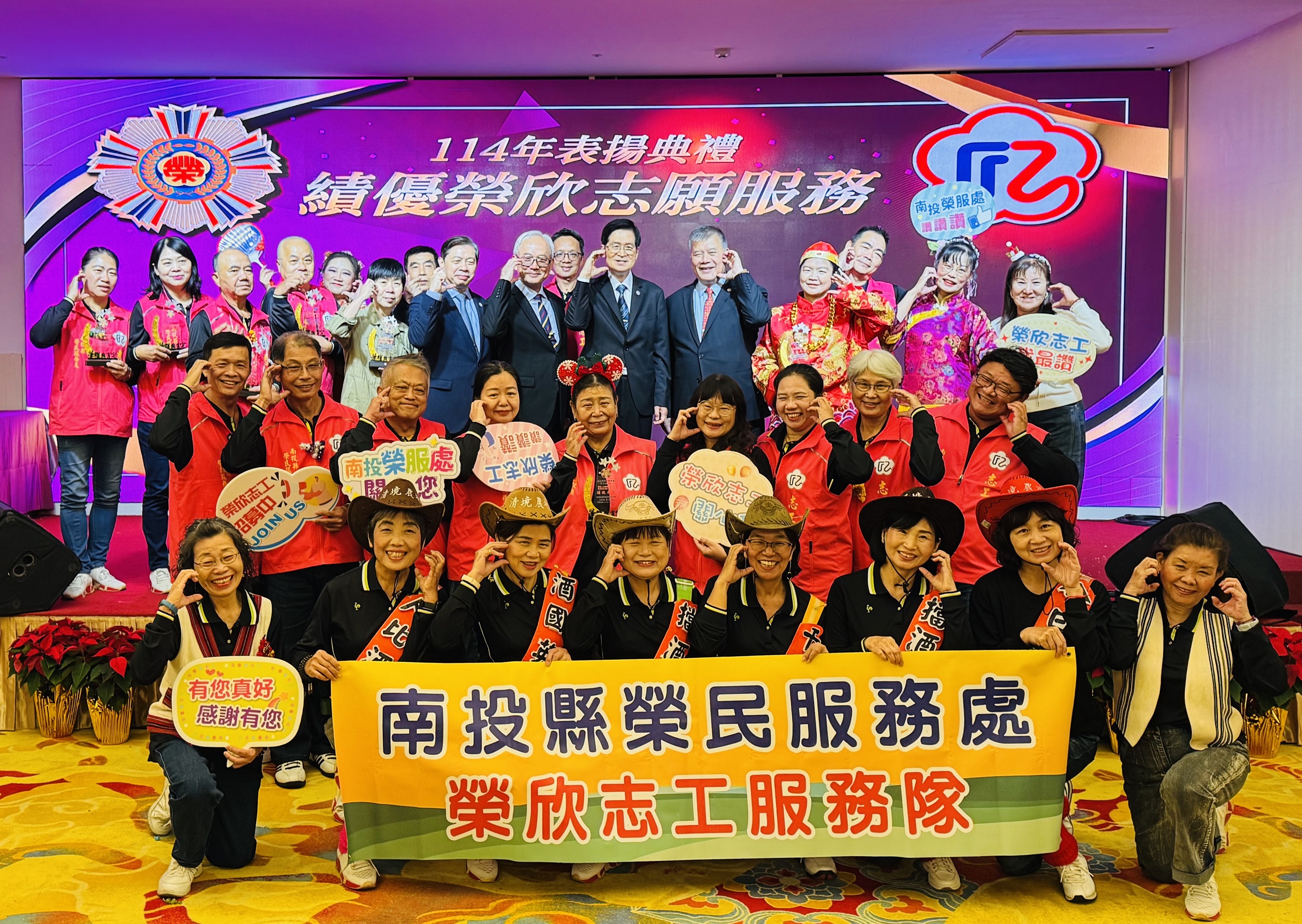 南投縣榮服處此次獲頒「績優志願服務運用單位」、「績優承辦人員」、另「績優社區志願服務組長」由吳佳蓉組長獲獎及「績優榮欣志工」則有林玉芬、林佳燕、陳秋刀及曾吉賢等4位獲得表揚,頒獎時全場熱烈歡呼,志工們亦感到無比榮耀。南投縣榮欣志工歷來表現亮眼,今年再度被指定於表揚活動中擔任壓軸表演,由王處長帶領南投榮欣志工共同演出「南投姑娘嫁娶趣」,表現出團結活潑熱鬧氣氛,並邀請現場嘉賓共舞,充分展現南投志工的活力與熱情。