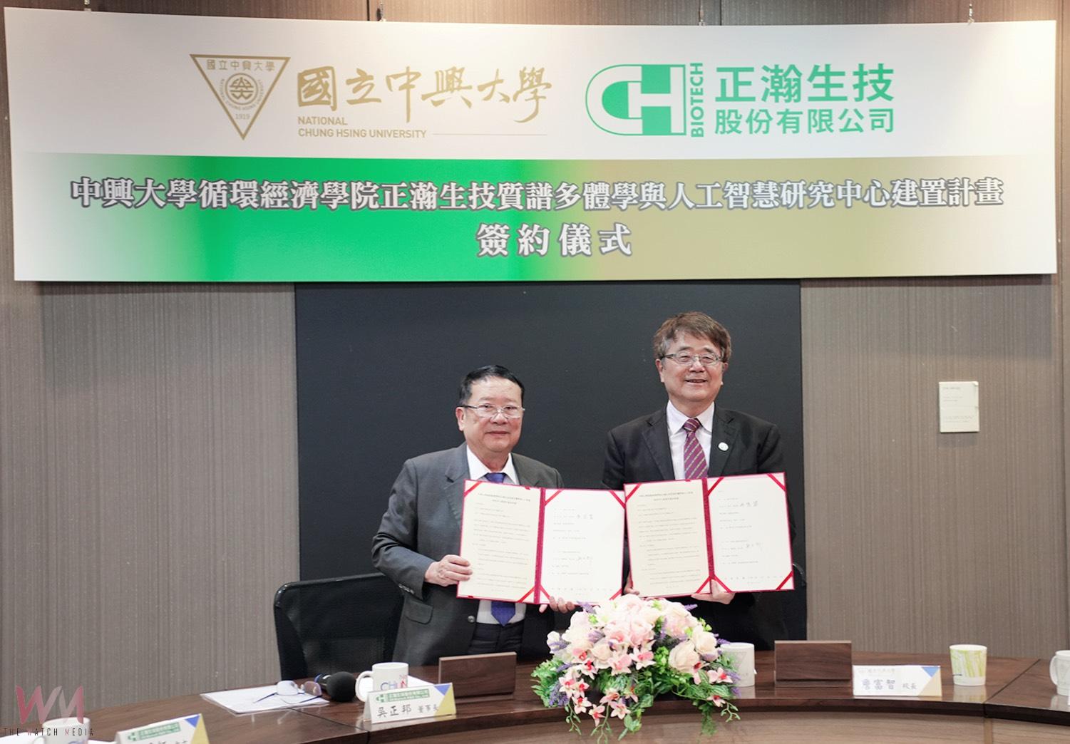 正瀚生技投入1.5億與中興大學共建全球首座農業永續導向之「質譜AI中心」,由興大詹富智校長(右)與正瀚生技吳正邦董事長(左)代表簽署。(圖/記者廖妙茜拍攝)