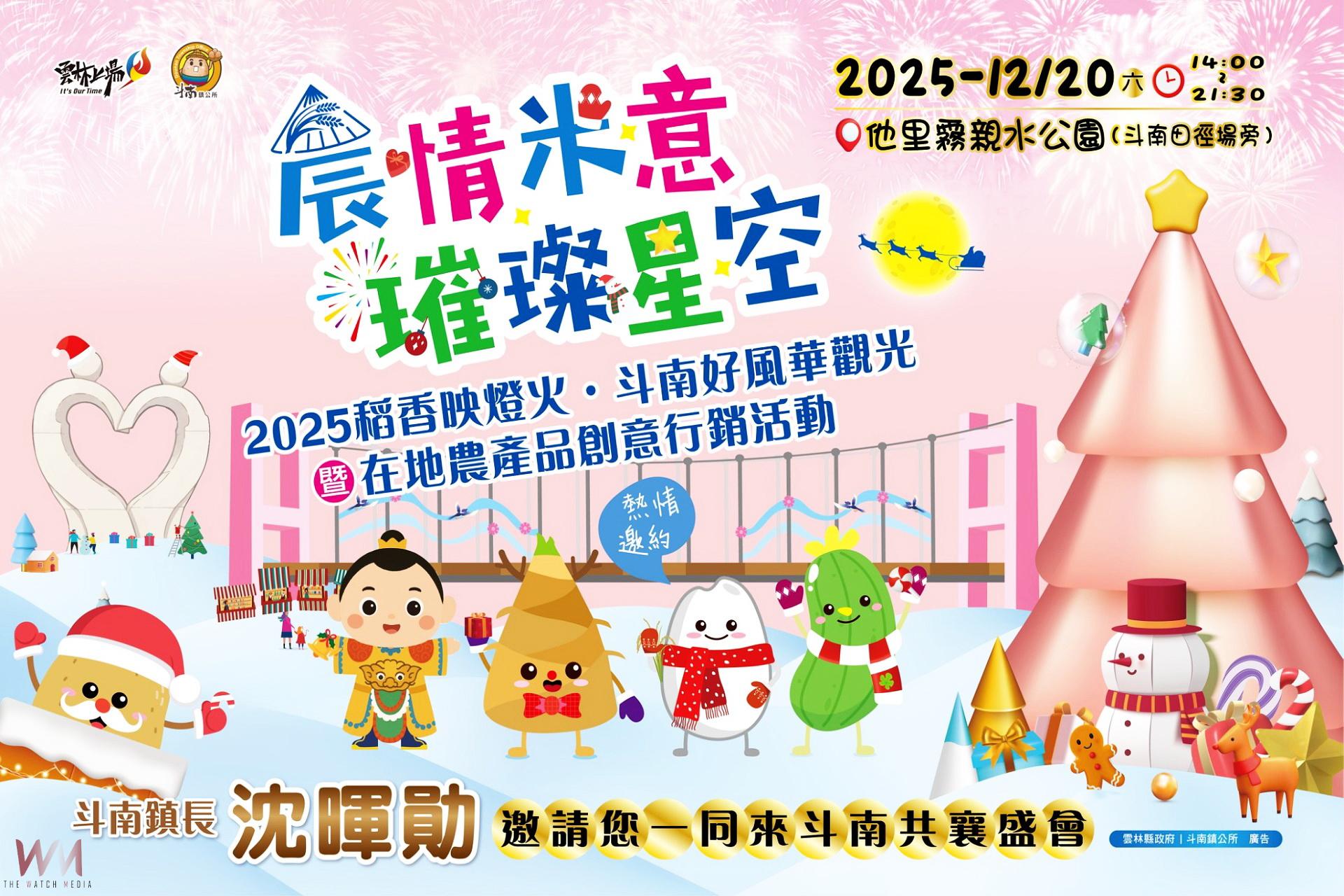 (觀傳媒雲林新聞)【記者簡勇鵬/雲林報導】斗南鎮公所以「農情米意、璀璨星空」為主題的「2025稻香映燈火斗南好風華」系列活動,分別為12月19日晚上6時在斗南火車站前廣場進行聖誕樹點燈,20日晚上6時30分在他里霧親水公園,結合聖誕節慶、米食市集展售、親子米食DIY活動、星光藝人演唱會與180秒聖誕煙火秀,歡迎民眾踴躍參加。