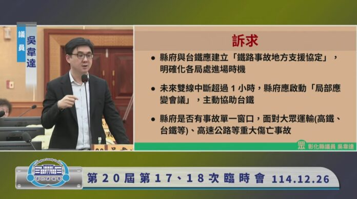 (觀傳媒彰化新聞)【記者陳雅芳/彰化報導】平安夜晚間,台鐵177次自強號疑因集電弓故障扯斷電車線,列車卡在彰化民生地下道上方,永安街平交道與地下道一度陷入嚴重擁塞。彰化縣議員吳韋達今(26)日在議會質詢,呼籲縣府建立重大運輸事故單一窗口,保障民眾夜間出行安全。