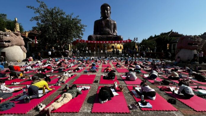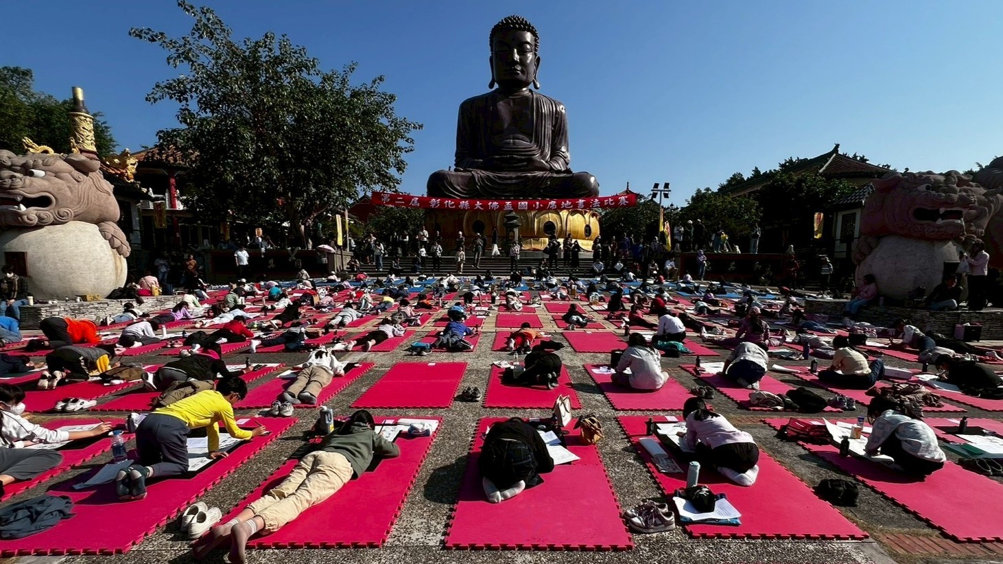 第二屆彰化縣大佛盃國小書法比賽,100多名學生全員趴地寫書法,場面既壯觀又趣味十足,吸引民眾駐足觀賞。(彰化八卦山大佛寺提供)