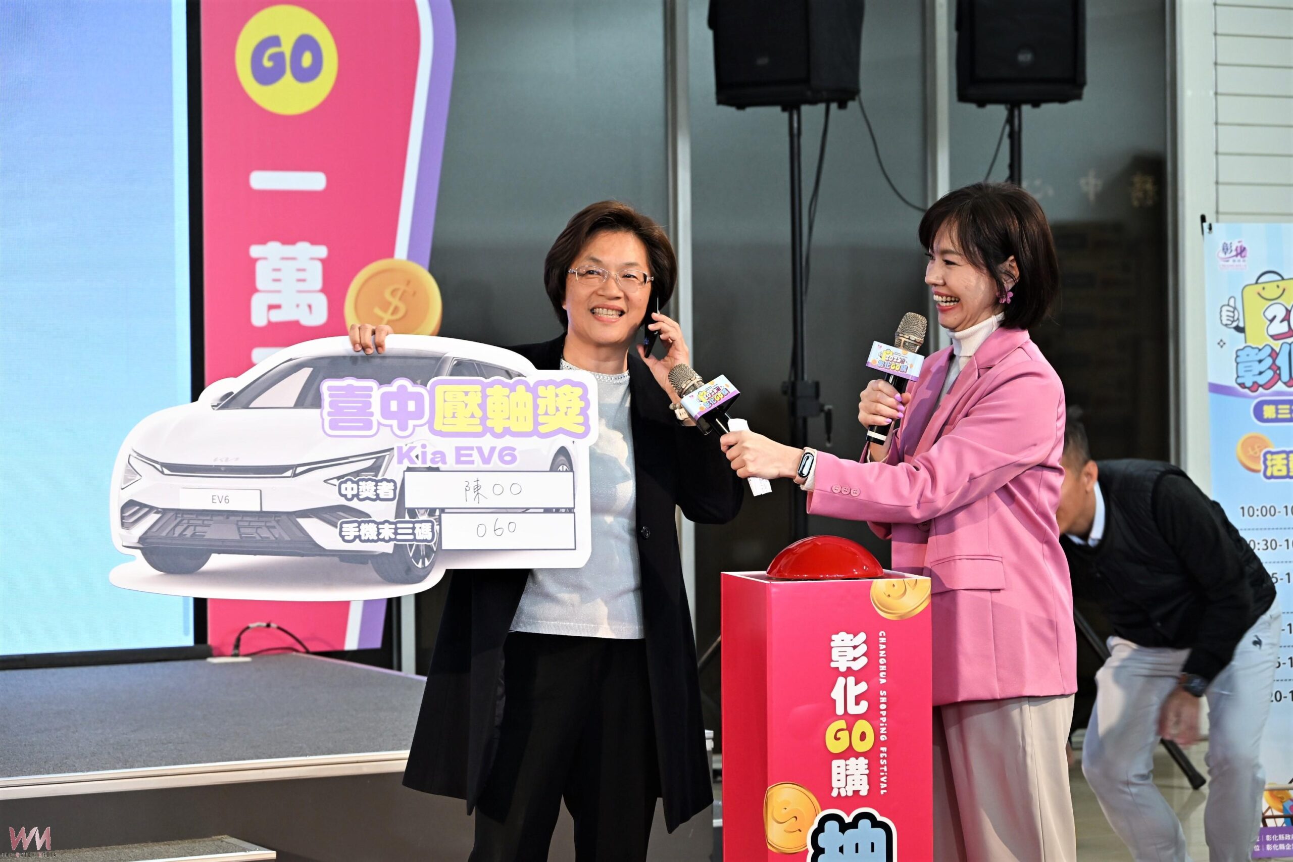 (觀傳媒彰化新聞)【記者陳雅芳/彰化報導】「2025彰化GO購」今(7)日在彰化縣府中庭舉行最後一次抽獎直播,現場氣氛超嗨,尖叫聲、掌聲不斷,兩台超狂新車-Kia EV6 Air電動車和SUZUKI JIMNY汽車,終於落入幸運得主手中,民眾看直播都跟著心跳加速!