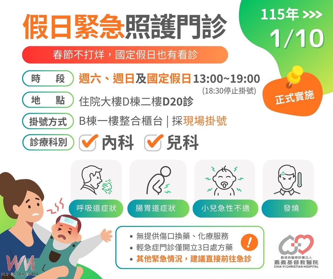 (觀傳媒嘉義新聞)【記者吳東林/嘉縣報導】為提供民眾更合宜的就醫選擇,舒緩假日急診病人壅塞情形,嘉義基督教醫院自115年1月10日起,正式開設「假日緊急照護門診」,於每週六、週日及國定假日下午提供輕急症門診服務,連春節也不打烊,讓過去假日生病只能往急診奔波的民眾,如今也能有門診可看,獲得即時而適切的醫療照護。