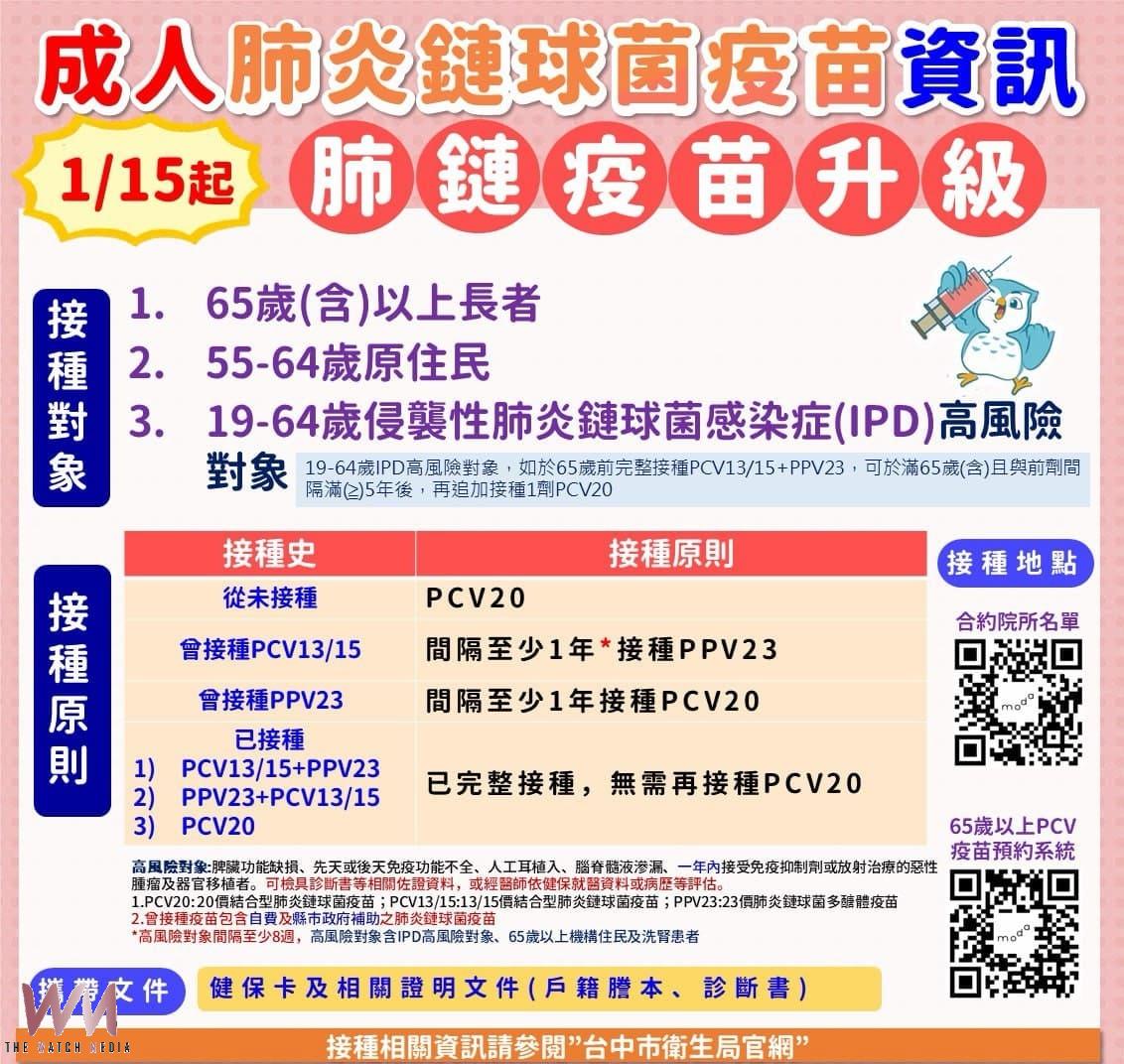 (觀傳媒中彰投新聞)【記者廖妙茜/台中報導】為與國際疫苗政策接軌並提升國人健康防護力,台中市政府衛生局配合中央政策,自115年1月15日起實施成人公費肺炎鏈球菌疫苗新制,將以新型20價結合型肺炎鏈球菌疫苗(PCV20),取代原本13價結合型疫苗(PCV13)加23價多醣體疫苗(PPV23)的兩劑接種方式,符合資格的市民僅需接種1劑,即可獲得完整保護力,接種更便利、守護更到位。