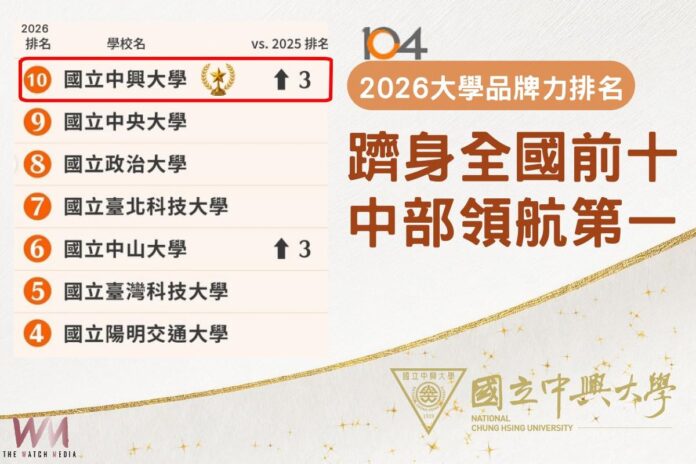 (觀傳媒中彰投新聞)【記者廖妙茜/台中報導】104人力銀行日前公布「2026大學品牌力」排名,中興大學整體排名挺進全國第10名,較去年上升3名,並獲「地區領航獎」中部一般大學第1名,展現品牌影響力與社會信賴同步提升的辦學成果。同時,興大更在核心實力指標上持續保持領先:學術聲望全國第4、研發力排名第5,彰顯興大長期深耕科研與產學人才培育的成效。