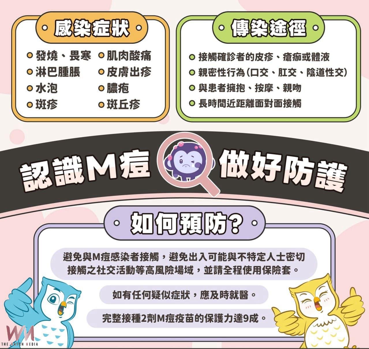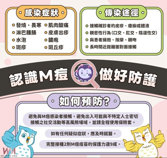 衛生局長曾梓展表示,接近年節假期,聚會與社交活動增加,提醒民眾M痘主要是透過高風險親密接觸傳播,應提高警覺並做好自我防護,避免透過交友軟體與不特定對象發生親密行為。若約會時發現對方臉部或身體出現疹子、水泡或膿疱等異常皮膚症狀,應避免親密接觸,以降低感染風險。