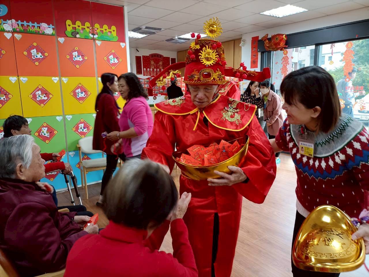 活動一開始,教室內便被鮮紅色的服裝與五彩飄帶點亮,桌椅旁擺放的春聯、燈籠和手作花飾,增添濃厚的過年氣息。高齡九十多歲的阿樟伯身穿財神爺裝,頭戴金色帽飾,手持糖果,與伸港鄉長黃永欽一同穿梭在長輩與來賓之間,笑著發放「甜甜糖果」,祝福大家新年平安、福氣滿滿。現場長輩們紛紛伸手接糖,笑聲與「恭喜發財」的祝福聲交織,溫馨而熱鬧。