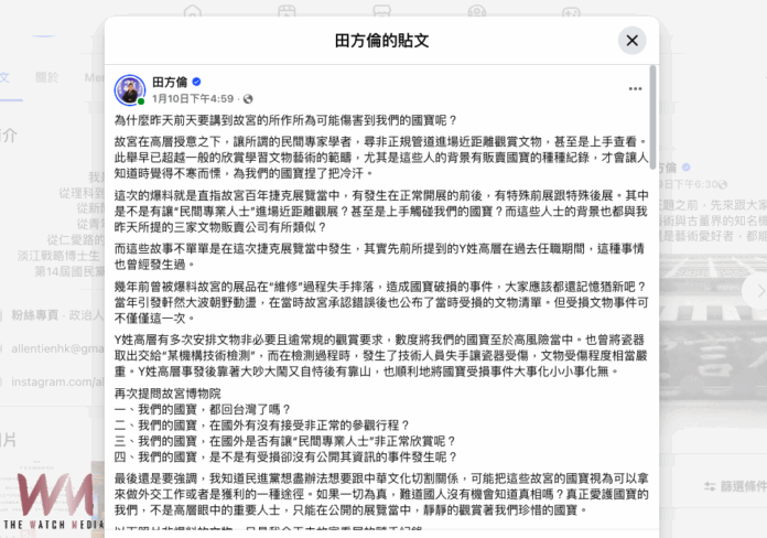 田方倫日前在臉書貼文,指故宮在高層授意之下,讓所謂的「民間專家學者」,循非正規管道進展場近距離觀賞文物,甚至是上手查看,此舉早已超越一般的欣賞學習文物藝術的範疇,尤其是這些人的背景,有販賣國寶的種種紀錄,才會讓人知情時頓感不寒而慄,為我們的國寶捏了把冷汗。