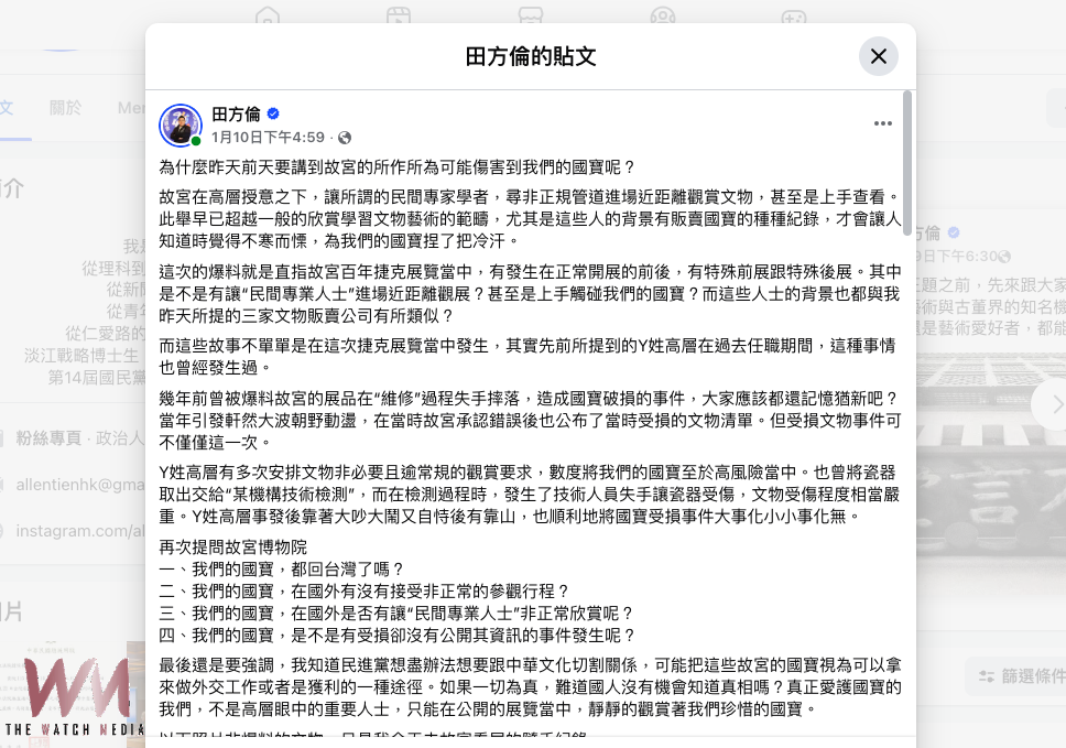 田方倫說,這次的爆料就是直指故宮百年捷克展覽當中,有發生在正常開展的前後,有特殊前展跟特殊後展。其中是不是有讓”民間專業人士”進場近距離觀展?甚至是上手觸碰我們的國寶?而這些人士的背景也都與我昨天所提的三家文物販賣公司有所類似?」