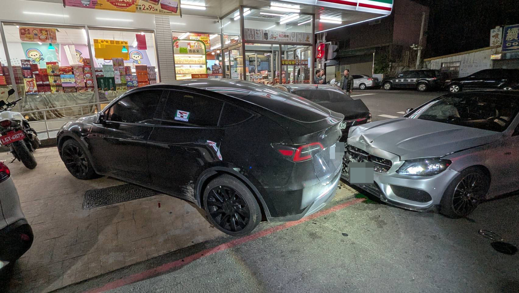 這起事故造成王女駕駛的銀色賓士車車頭嚴重毀損,引擎蓋凹陷、零件散落一地,遭撞的黑色賓士與黑色特斯拉車尾也明顯受損,所幸事發時超商門口未有行人經過,否則後果恐不堪設想。詳細肇事原因及責任歸屬,仍待警方進一步調查釐清。