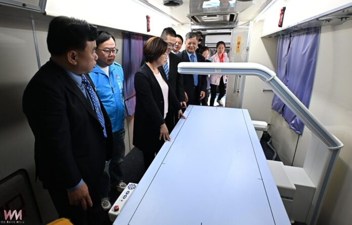 王惠美說,這輛新車搭載雙能量X光吸收儀,可精準測量脊椎、腰椎及髖關節的骨密度。「過去長輩要檢查骨質密度,可能得跑大醫院或健檢中心,現在巡迴檢測車就像『骨健康外送車』,直接開到社區,讓長輩更方便、更安心。」