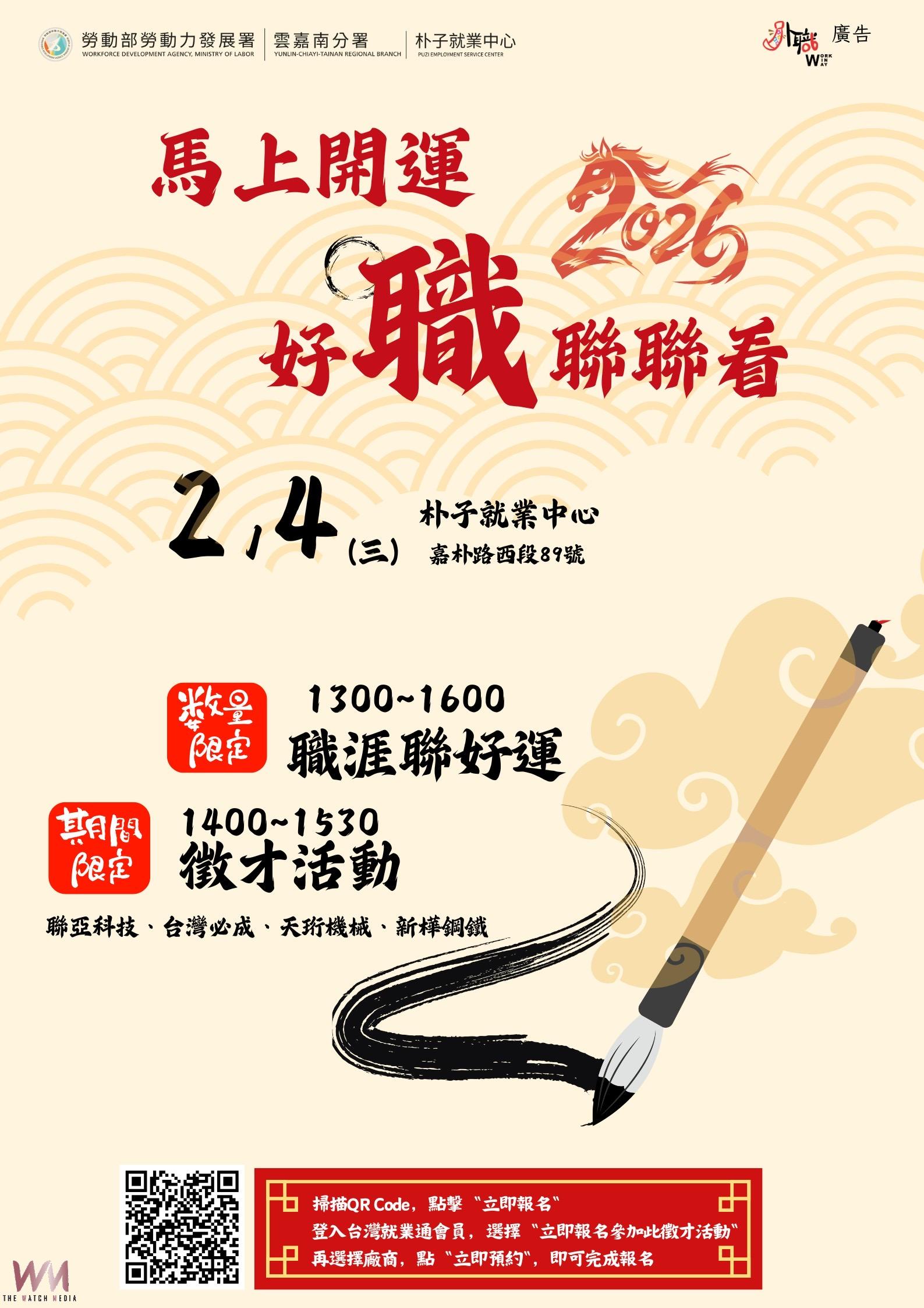 就業服務中心除了提供專業諮詢與媒合活動外,也規劃舒壓活動與應景體驗,由專業視障按摩師現場提供服務,讓民眾舒緩面試壓力,以及有免費客製化春聯揮毫。朴子就業中心張春美主任強調,除了這4場徵才活動外,115年台灣燈會將在嘉義辦理,目前正在強力招募燈會會場臨時工作人員600逾人,工作時間依分派在2月17日至3月15日區間,歡迎有興趣的民眾至朴子就業中心設置的雲端完成登記(https://forms.gle/yJJMt3MZfEmSKmVZ8 )或洽詢05-3621632。
