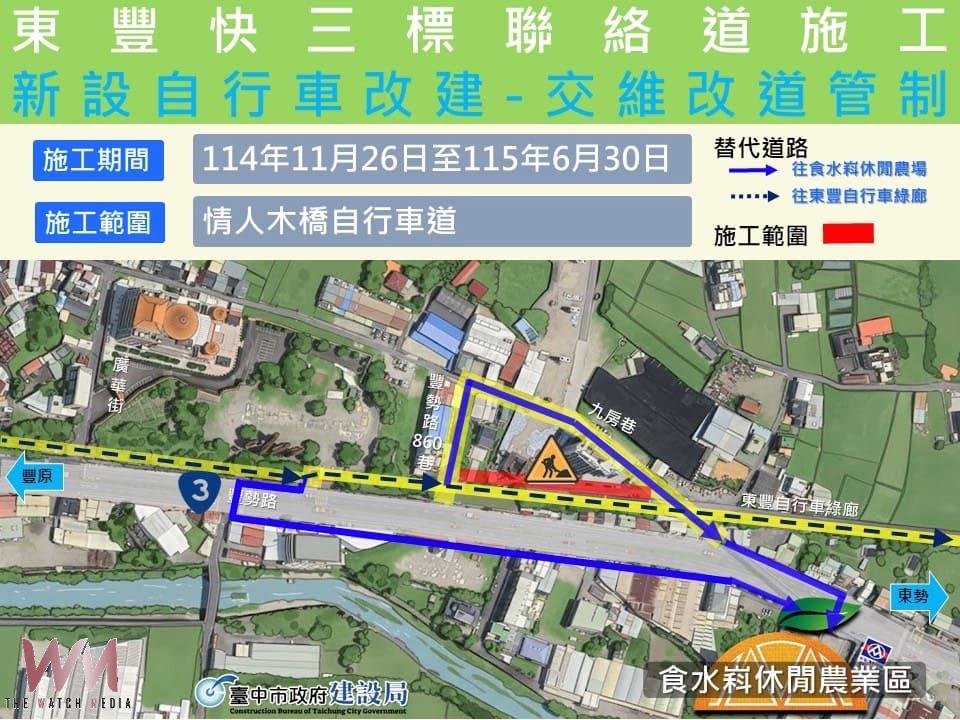 建設局長陳大田表示,「東勢-豐原生活圈快速道路」是大台中高速路網的最後一哩路,盧市長上任後重啟環評推動,並111年10月復工,並以115年東勢石岡段局部通車及118年全線完工為目標積極推動。隨工程將跨越台3線豐勢路施作階段,為順利推動後續工程,相關交通維持計畫已完成核定。東豐自行車綠廊施工期間,遊客可利用施工團隊所規劃替代道路通行,亦可依引導動線前往食水嵙休閒農場作為中繼休憩點。另因懸臂工作車將推進跨越台3線豐勢路,施作期間將局部封閉豐勢路,現場將設置指揮交通之人員加強指揮交通,維護人車安全。