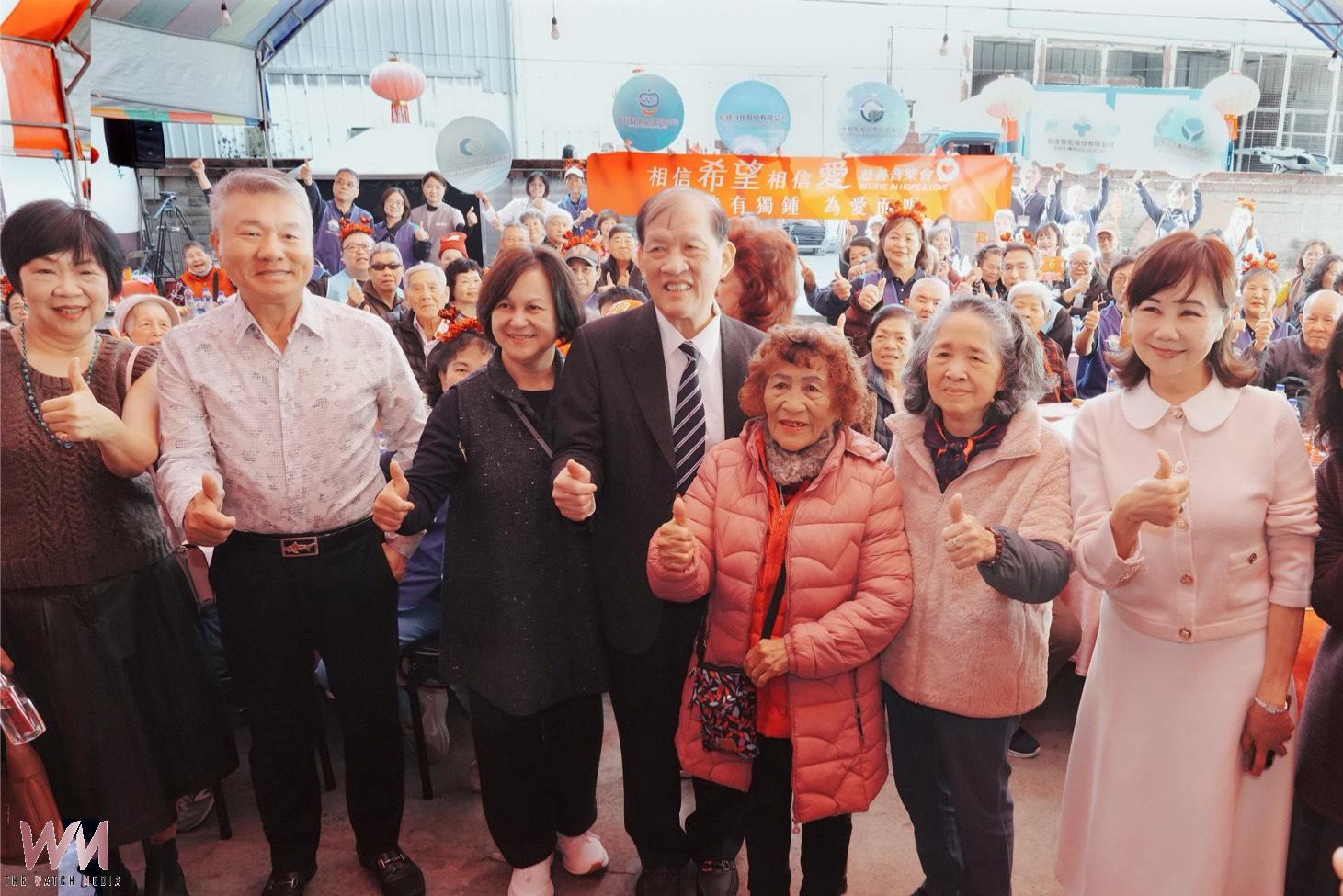 中醫大附醫院長周德陽(右4)與林增連慈善基金會董事長林嘉琪(右1)等貴賓與百位長輩齊聚合影,提前感受團圓迎新的溫暖。(圖/記者廖妙茜拍攝)