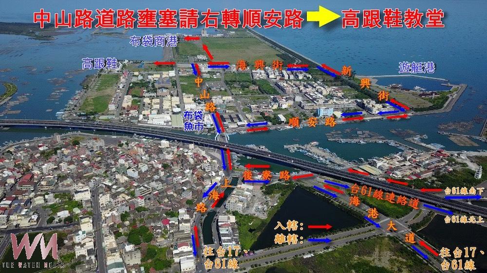 布袋分局呼籲,前往布袋觀光魚市或高跟鞋教堂之民眾,可多利用台17線或台61線進入布袋市區,並循上海路、海港大道或台61線連絡道進入布新橋後直行中山路;若遇中山路車流壅塞時,可改道右轉順安路,續行新興街、海興街前往高跟鞋教堂,並多加利用教堂周邊設置之免費停車空間。