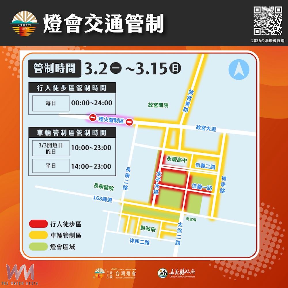 (觀傳媒嘉義新聞)【記者 陳惲朋 /嘉義報導】嘉義縣政府將在3月3日至3月15日盛大辦理「2026台灣燈會」,為維護活動期間人流與車流安全,縣政府及燈會周邊道路將自3月2日起,至3月15日實施交通管制,縣政府呼籲用路人行經管制區域時應遵守指揮及標示,並鼓勵民眾建議多利用大眾運輸及接駁服務。