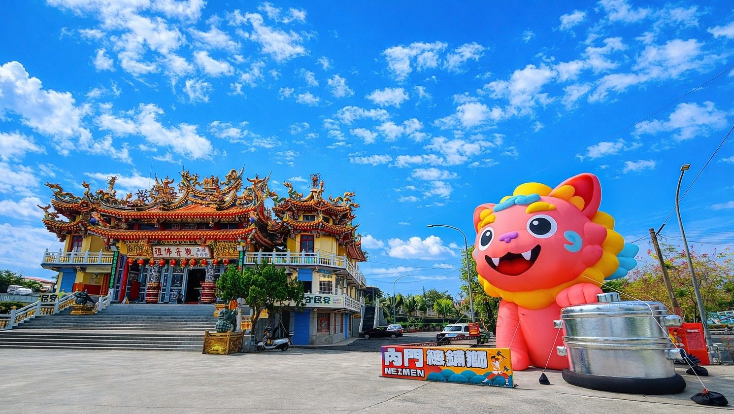 今年活動最大話題亮點,莫過於首次亮相的大型氣偶裝置《總鋪獅》。總鋪獅以粉紅金彩為主色,融合宋江陣獅頭造型與總舖師意象,象徵內門辦桌文化「聚人、聚心」的熱情款待精神。設計中結合蒸籠、陣頭與獅陣元素,白天吸睛、夜間發光,成為南海紫竹寺園區最具辨識度的打卡新地標,也象徵守護一桌一桌延續下去的人情與故事。