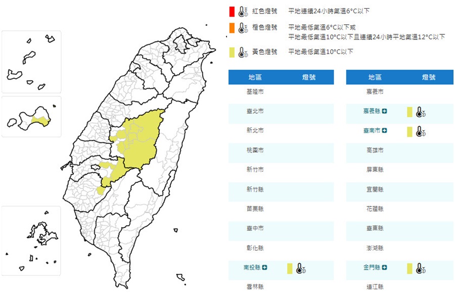 地方新聞 影音/0211低溫特報 投嘉南金寒冷 由 採訪中心 - 2026-02-11 08:56 FacebookTwitterWhatsAppLINECopy URL 生活中心/綜合報導 今天2月11日至明天12日清晨鋒面通過及東北季風增強,北部及東北部白天氣溫稍有下降,各地早晚偏涼;氣象署今晨發出低溫特報,受輻射冷卻影響,各地氣溫明顯偏低,上午低溫區域有:南投、嘉義縣、臺南、金門有10度以下低溫發生的機率,請注意。 降雨方面,基隆北海岸、臺灣東半部地區及恆春半島有局部短暫雨,大臺北地區、北部山區及馬祖有零星短暫雨,其他地區及澎湖、金門為多雲到晴。