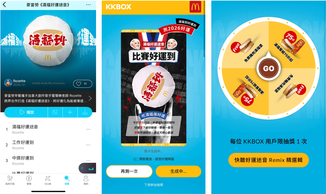 為了讓好運不只在捷運站被聽見,麥當勞也將這份「滿福到・好運到」放進 KKBOX裡「滿福好運3重奏」。只要進到麥當勞與 KKBOX 的活動頁,就能一次完成「聽好運、測好運、享好運」,把好運變成日常裡最輕鬆、也最有感的小儀式。
