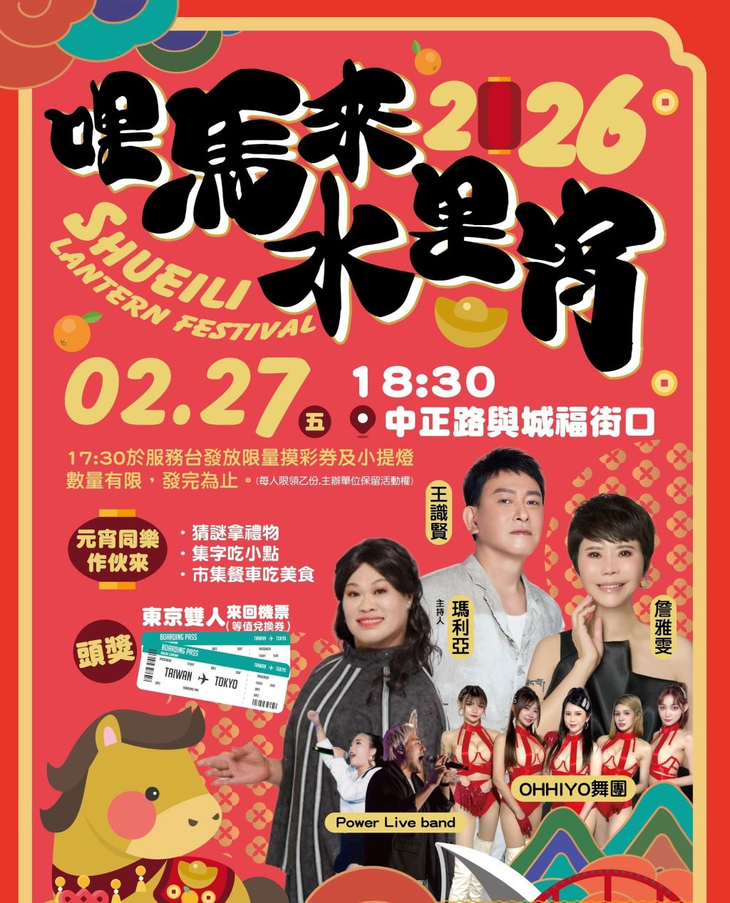 為迎接元宵佳節、與鄉親及遊客共度溫馨團圓的年節時光,水里鄉公所將於2月27日(星期五)盛大舉辦「2026哩馬來水里宵」元宵晚會,活動自晚間6時30分在水里鄉中正路與城福街口正式展勘,結合重量級藝人演出、創意燈會、美食市集及豐富摸彩活動,打造水里最具代表性的元宵夜盛典,誠摯邀請全國民眾蒞臨同樂。
