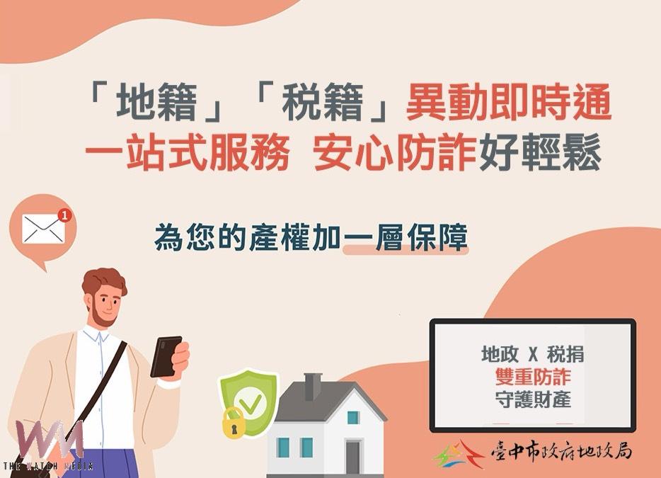 (觀傳媒中彰投新聞)【記者廖妙茜/台中報導】隨著不動產詐騙手法不斷翻新,危害民眾財產安全甚鉅,為此台中市政府地政局與中市政府地方稅務局特別整合現行「地籍異動即時通」及「稅籍異動即時通」服務,推出通用全市的地政、稅捐機關一站式申請服務。民眾透過單一窗口即可同時完成兩項服務申請,稅務申報或不動產移轉時,即可收到政府機關通知(電子郵件或簡訊),免除奔波往返之不便,全面提升民眾財產安全保障。