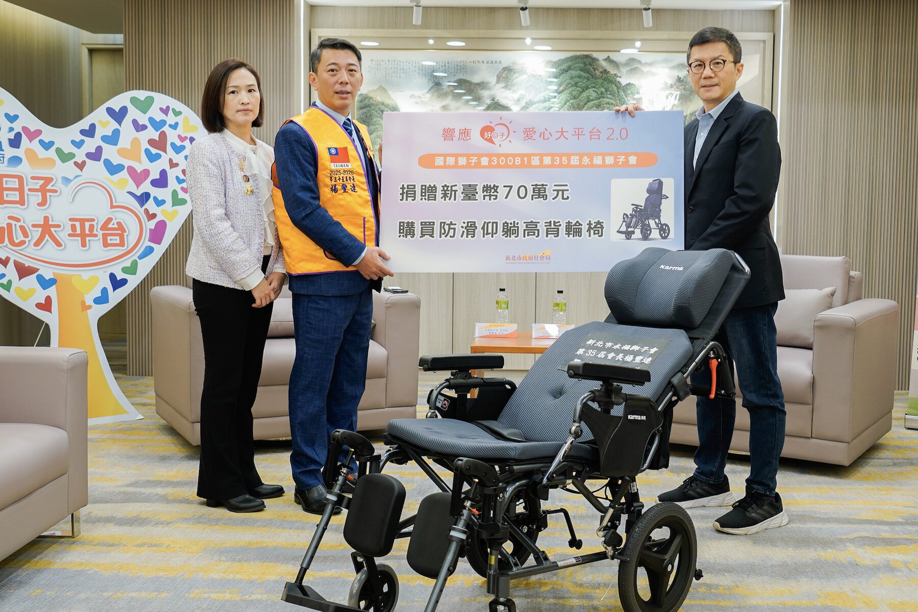 ▲第35屆永福獅子會會員代表聯合捐贈35台伸展防滑仰躺高背輪椅。(圖/新北市社會局 提供)
