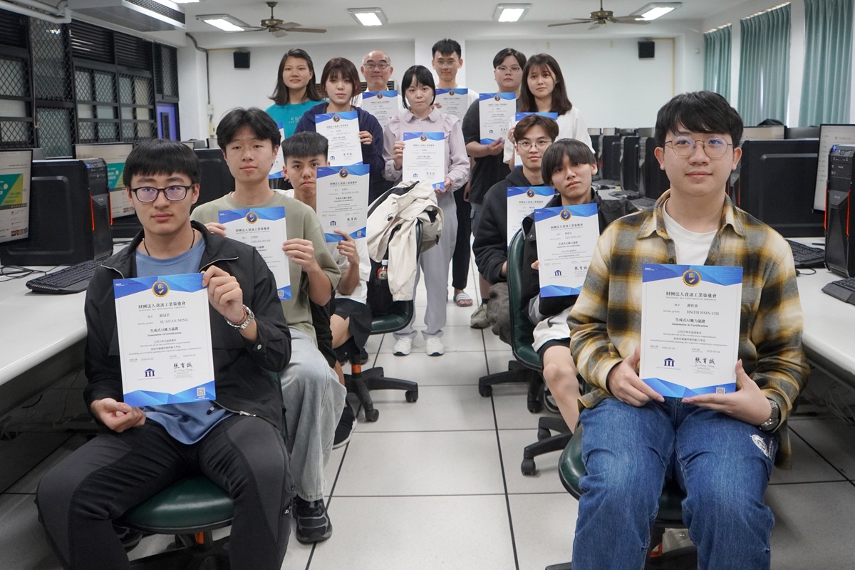 AI浪潮席捲全球,大葉大學資訊工程學系為強化學生在生成式人工智慧領域的專業實力,取得資策會「生成式AI能力認證」考場資格,打造證照考場等級教室,學習、備考一條龍,首波考試已有17位學生考取證照。