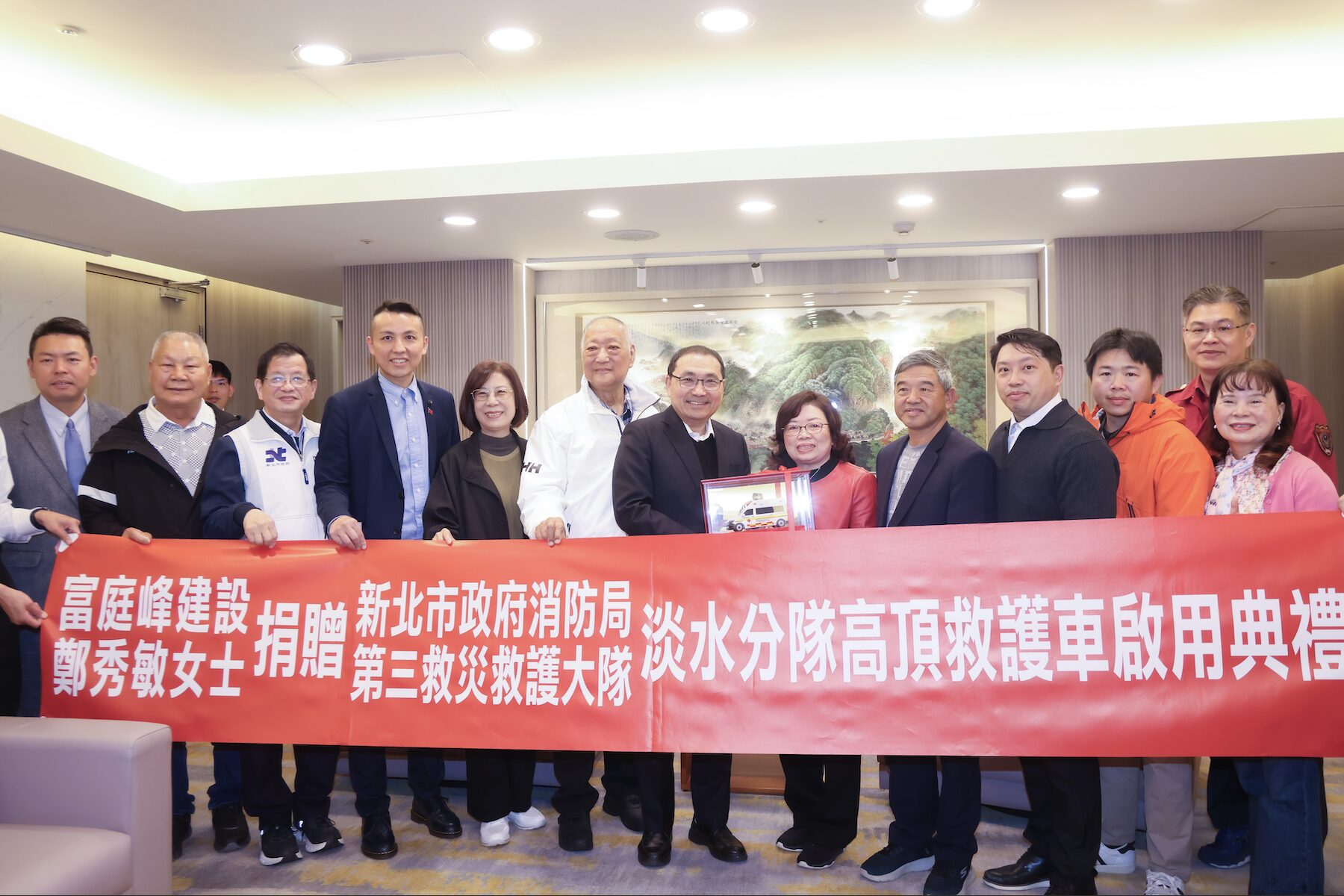 富庭峰建設捐贈新北市政府消防局第三救災救護大隊高頂救護車1輛,(10)日於市府舉行捐贈典禮,由新北市長侯友宜代表受贈並頒發感謝狀。他表示,淡水已有20萬人口,未來隨著都市開發,人口還會持續增加,這輛救護車將有效提升淡水區的緊急救護能量。