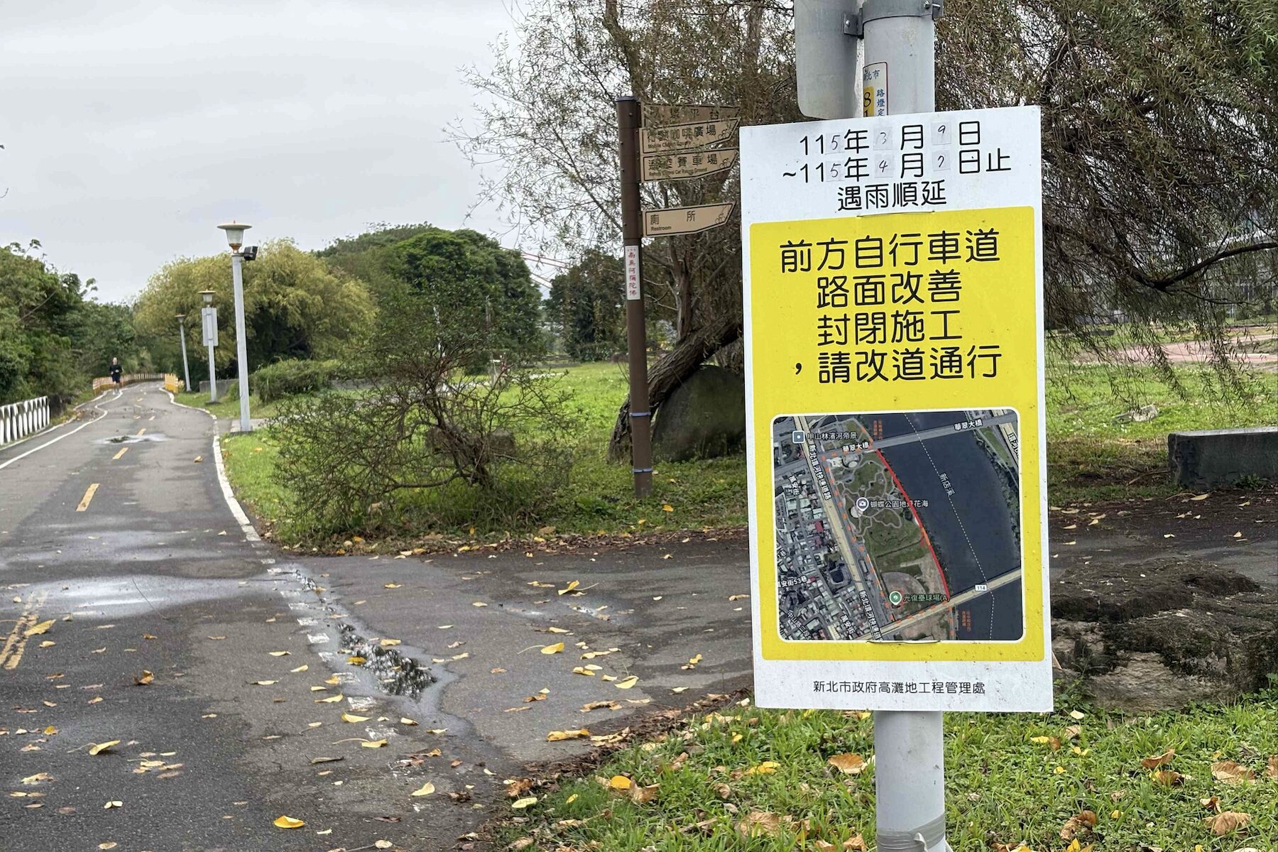 高灘處表示,江子翠自行車道(鄰板橋蝴蝶公園)為連接中和及板橋之間的重要自行車道,因部分路段受強降雨等環境影響,導致路面破損及位移。高灘處已在第一時間封閉並安排即日起至115年4月7日進行修繕工程,施工預計將舊有的路面打除更新。