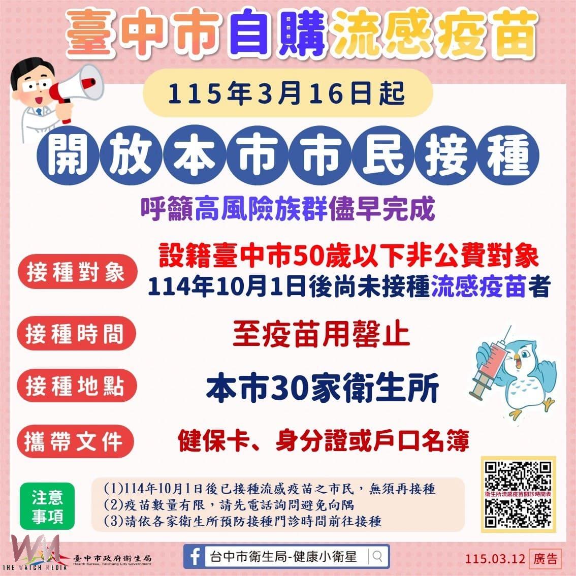 (觀傳媒中彰投新聞)【記者廖妙茜/台中報導】流感疫情仍於社區持續傳播,為提升市民整體防護力,台中市政府自購流感疫苗將自115年3月16日起開放設籍台中市、50歲以下且非公費流感疫苗對象接種。