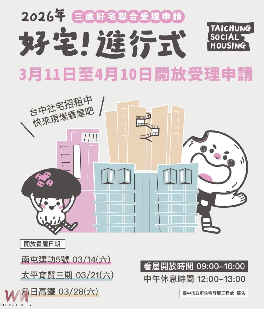 (觀傳媒中彰投新聞)【記者廖妙茜/台中報導】台中市「南屯區建功5號」、「太平區育賢三期」、「烏日區高鐵」等3處好宅,將辦理聯合招租作業,即日起至4月10日開放受理申請。其中,「烏日區高鐵」好宅是烏日區首座社會住宅,位於高鐵特區,區位條件優良,民眾可把握時間踴躍申請。