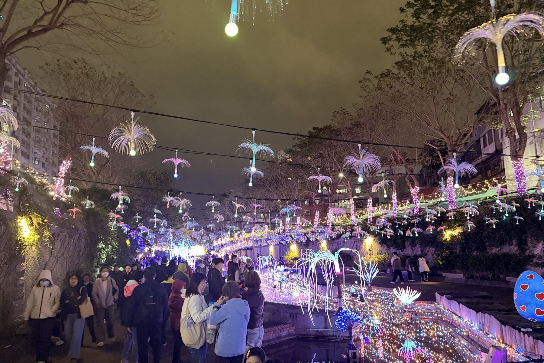 新莊在地居民周小姐說,與家人散步經過中港大排就會覺得很不容易,曾經的大臭水溝,如今成為了新莊人休閒常常去的地方,尤其是每年3月的白色情人節,都會充滿期待,今年的光雕更夢幻,被浪漫星河包圍的夜晚,與家人留下許多美好回憶。