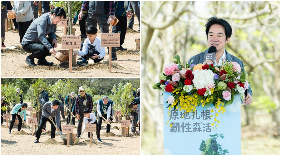 賴總統說,三月春暖花開是種樹的好季節,來到警政署「反恐訓練中心」和大家一起參加植樹節活動,感謝內政部、農業部及環境部攜手合作,為土地種下新的希望。反恐訓練中心所在位置就是濕地保育軸帶,除了公共設施,周邊還有農田、埤塘,是城市與自然交會的重要節點,在此植樹特別有意義。