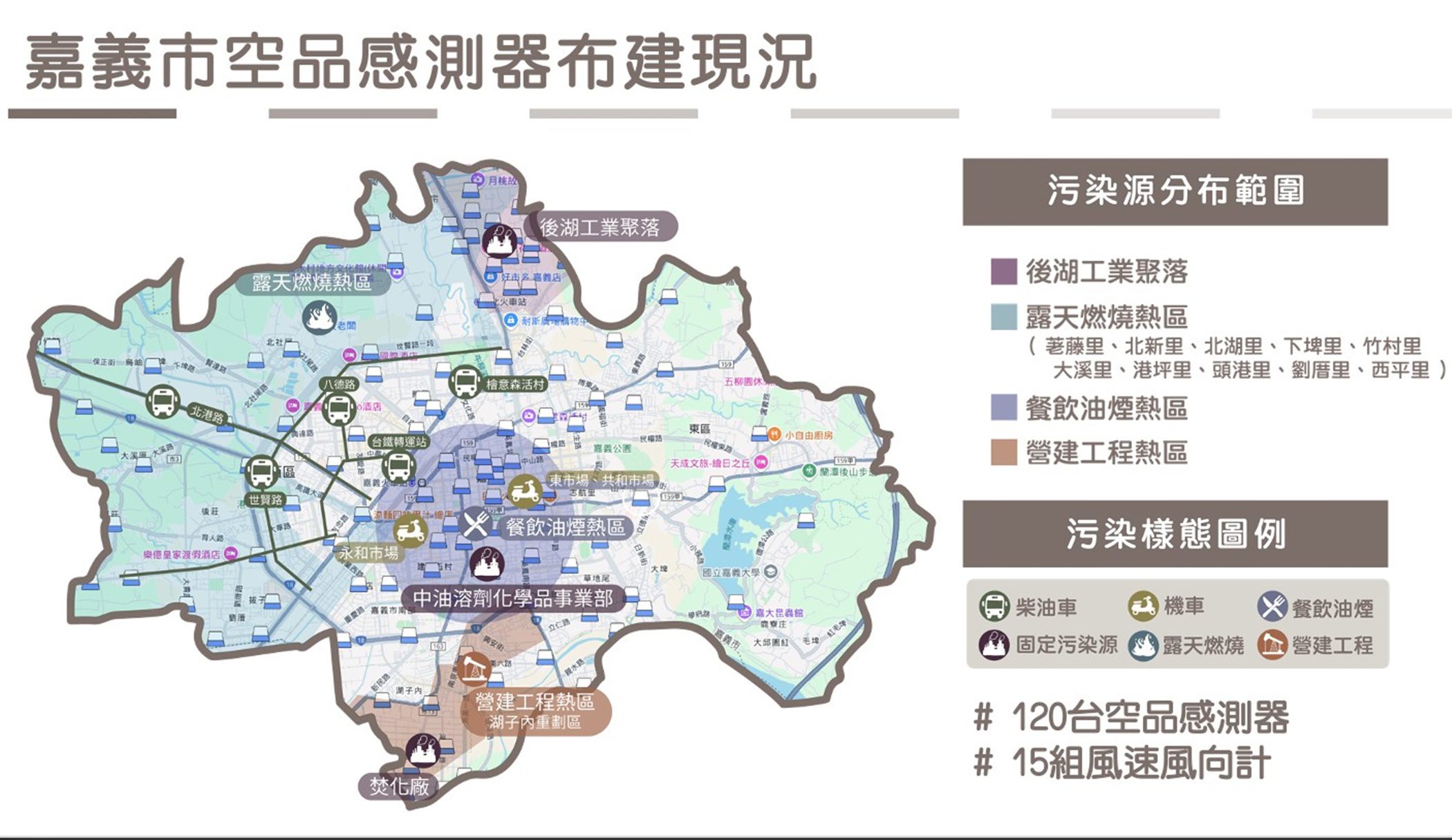 嘉義市佈建「空氣品質感測物聯網」,目前轄內共設置120台空氣品質微型感測器,應用物聯網科技協助空污管制,改善微尺度的空氣污染問題,並以112年為基準年,運用即時感測數據標定市內5大PM2.5污染潛勢熱區,分析不同區域污染特性因地制宜執行管制策略,有效提升環境治理效率與精準度,落實以科學數據為基礎的治理模式,促成114年5大熱區PM2.5平均濃度較基準年改善10.6%。並強化跨機關合作,於114年將空氣品質感測物聯網結合消防局119火災派遣系統,於接獲火災訊息時可第一時間同步空品監測數據,自動產生影響範圍圖卡並透過環保局臉書發布,提醒下風處民眾採取防護措施,強化整體防災與環境治理韌性。