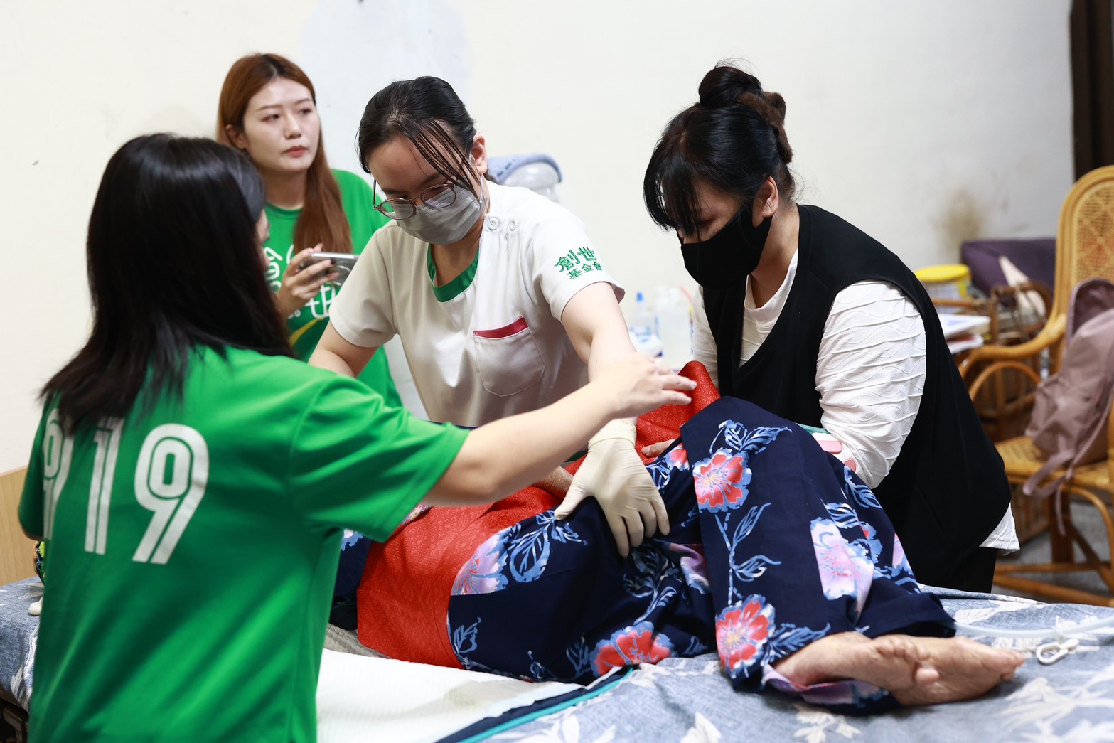 創世基金會花蓮分會院長游家慈(中)等人為植物人個案換穿和服。(圖∕創世花蓮分會提供 )