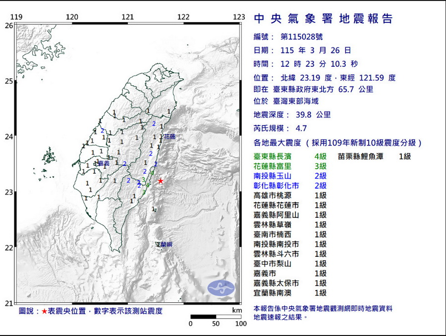 地方新聞 影音/0326中午規模4.7地震 最大震度在臺東4級 由 採訪中心 - 2026-03-26 15:08 FacebookTwitterWhatsAppLINECopy URL 生活中心/綜合報導 今天3月26日12時23分10秒,臺灣東部海域發生芮氏規模4.7有感地震,震央在臺東縣政府東北方65.7公里處,地震深度39.8公里,氣象署即時地震資料顯示,臺東縣長濱及成功最大震度4級,東河3級,池上、海端、利稻2級,鹿野、綠島、卑南、蘭嶼都是1級。 其他縣市震度分別為:花蓮最大震度3級,南投及彰化2級,高雄、嘉義縣市、雲林、臺南、臺中、宜蘭、苗栗均為1級。 地震資料顯示,這是今年3月第28起地震,其中12個顯著有感地震,16個是小區域地震。